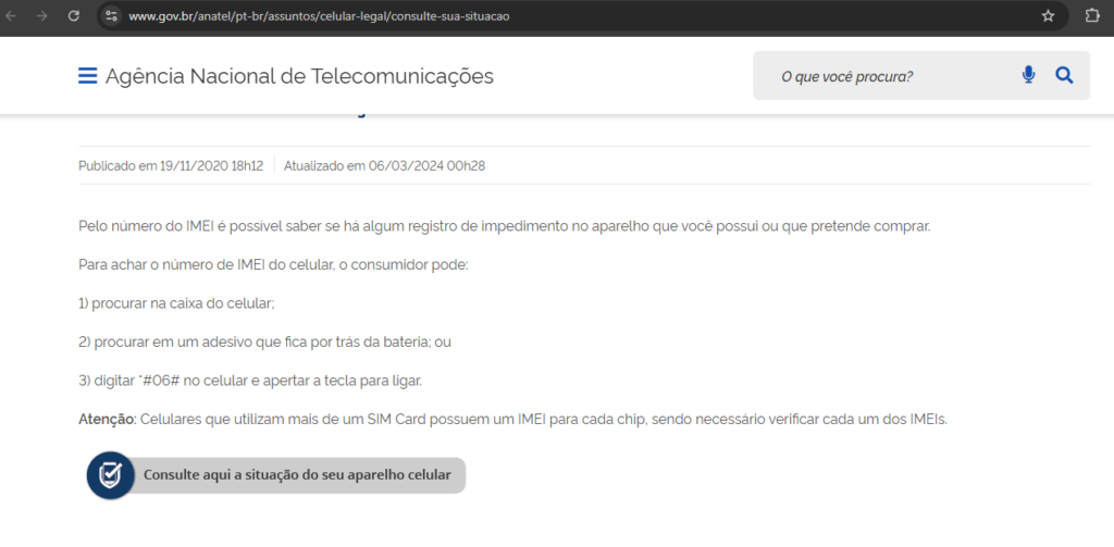 - Depois, acesse o portal Consulte sua situação da Anatel via Gov.br e clique em “Consulte aqui a situação do seu aparelho celular” como mostrado no print: