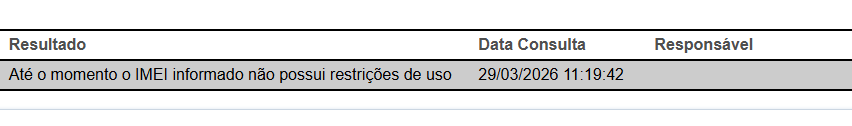 Caso não haja restrições, a mensagem “Até o momento o IMEI informado não possui restrições de uso” será apresentada.